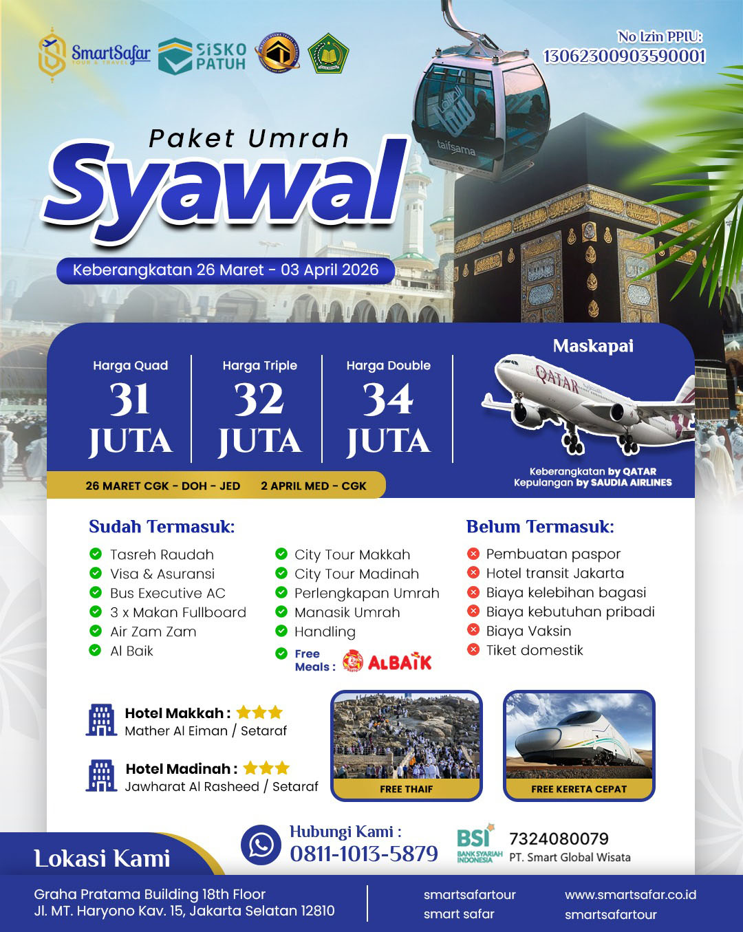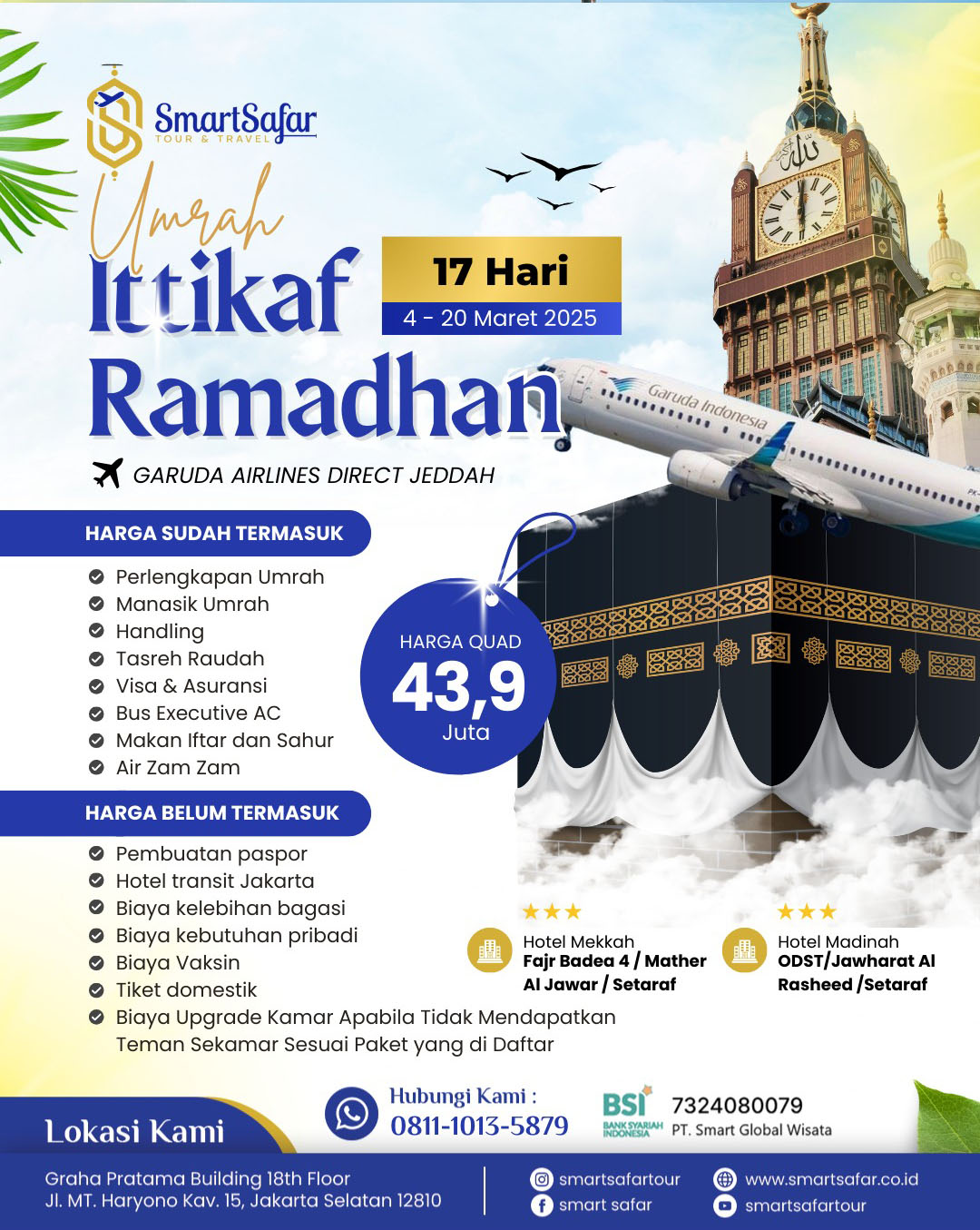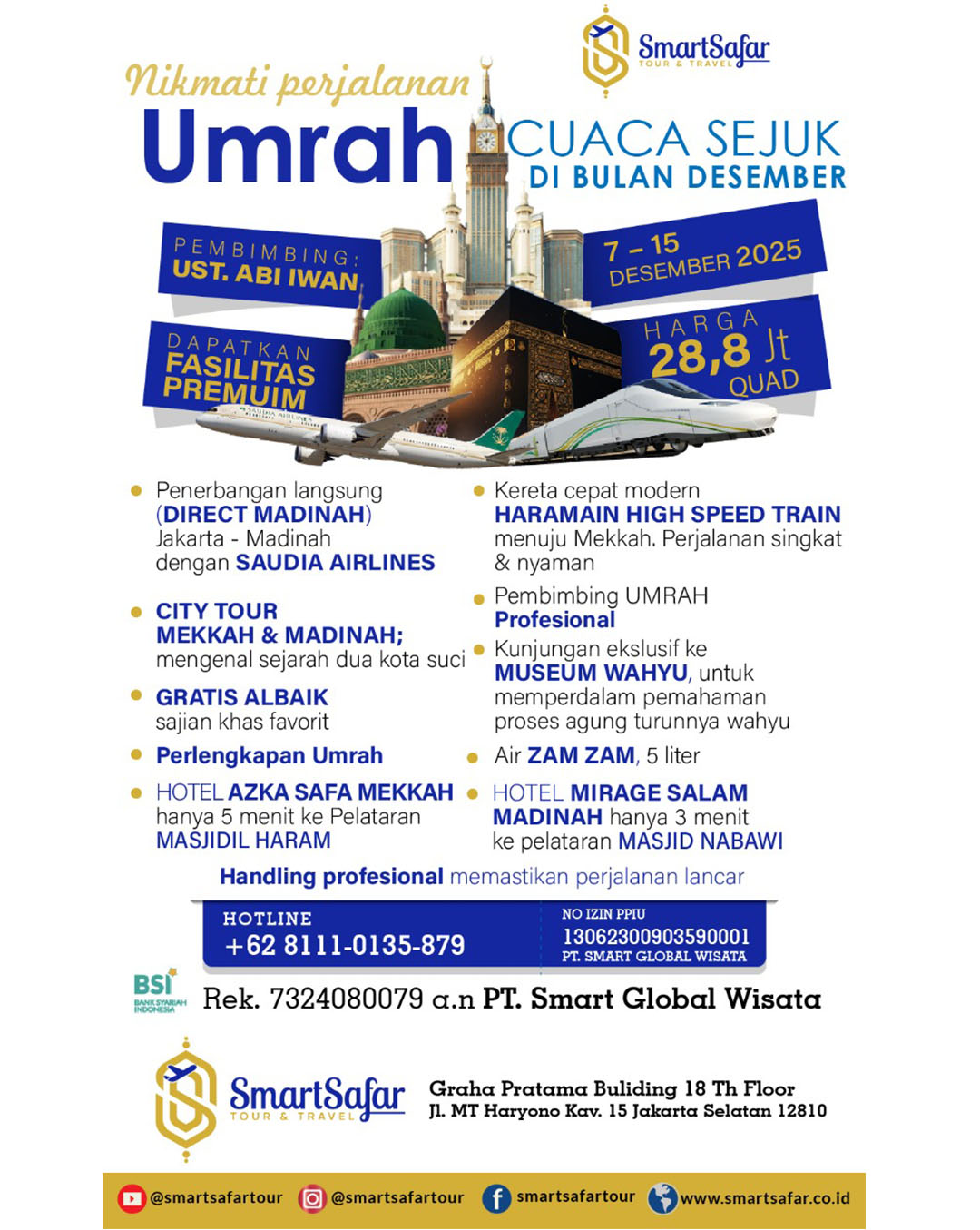 Ibadah ke tanah suci, menunaikan umrah atau haji, merupakan impian setiap Muslim. Thawaf di Baitullah, berdoa di Multazam, meminum air Zamzam, ziarah ke makam Nabi, shalat di Raudhah, dan lain-lain adalah mementum tak terlupakan dalam kehidupan seorang Muslim. Karena itu, merupakan suatu kebanggaan bagi kami SmartSafar tour & travel, dapat melayani dan membersamai para Tamu Allah untuk mewujudkan cita-cita mulia beribadah di tanah suci. Seraya meluruskan niat, menguatkan ikhtiar, dan menyelami manasik yang selaras Sunnah Nabi shallallahu ‘alaihi wa sallam, semoga azzam yang baik dan indah ini menjadi milik kita semua. Allahumma aamiin.